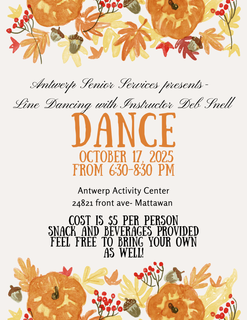 YOU MUST BE 60 AND OLDER TO ATTEND THESE ACTIVITIES AND BE A RESIDENT OF ANTWERP TOWNSHIP/PAY TAXES TO OUR SENIOR MILLAGE or if you are from Almena or Waverly township.