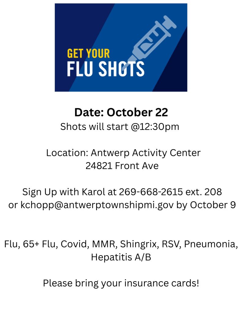 Questions? contact Karol @ 668-2615 ext.208 or email KChopp@antwerptownshipmi.gov or you can call Southwest Michigan Senior Services