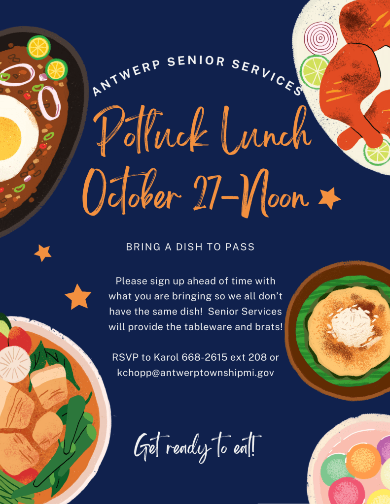 Seniors who reside/is a taxpayer in Antwerp Township and contributes to the Antwerp Senior Millage and are 60 years of age or over, we will be taking order for meals by Monday by 3pm and delivering weekly on Thursday’s between 11:30am-12:30pm.